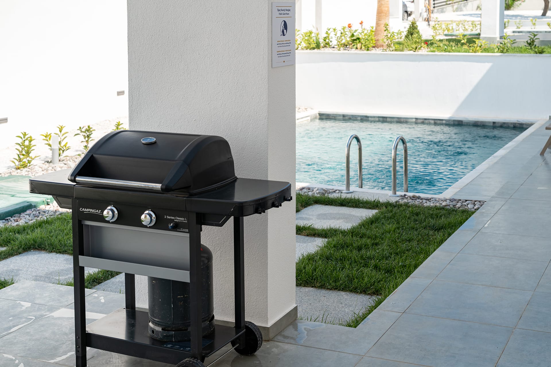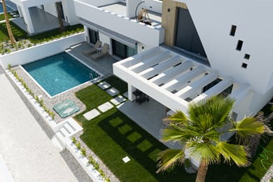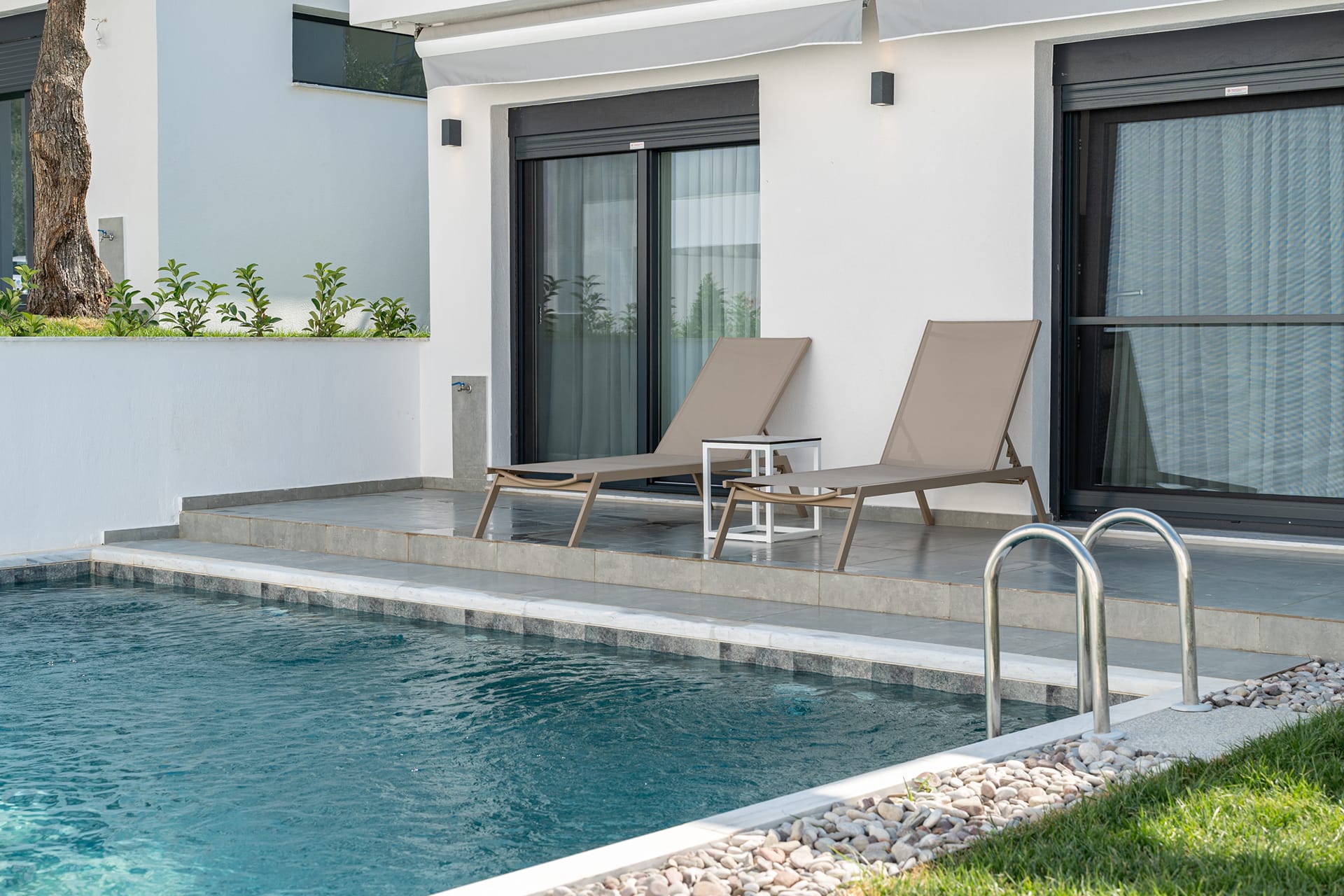 Fully equiped three bedroom villa with a separate bedroom, a living room , a dining area, a bathroom and a kitchen on the ground floor while on the first floor you can find another two seperate bedrooms with one bathroom more. On the outside area you can enjoy your own private pool with sunbeds or enjoy the sunset on the rooftop.