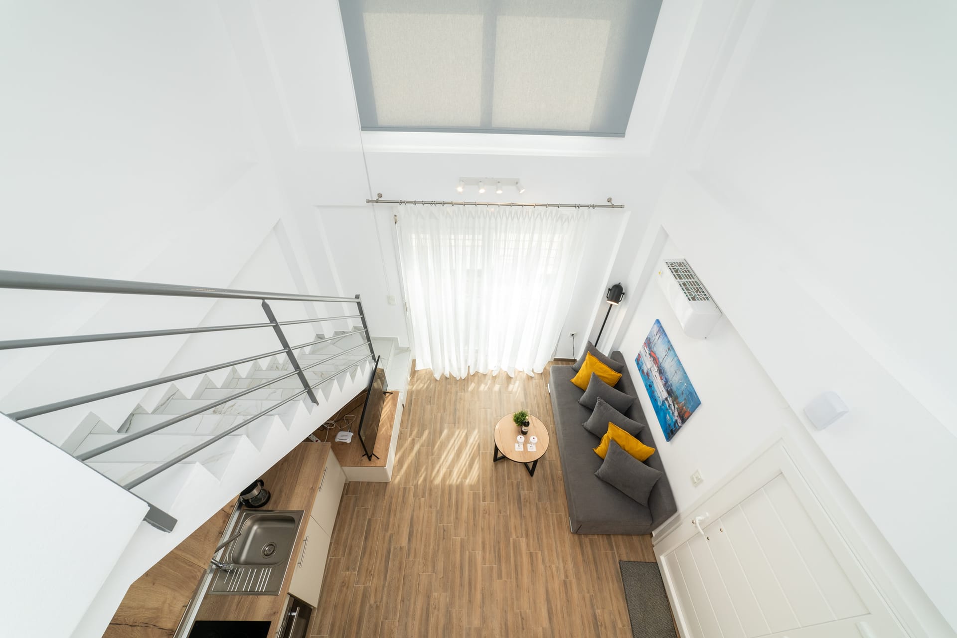 Our stylish two-bedroom lofts are perfect for families, friends, or couples seeking extra space and comfort. Spread across two levels, these lofts feature, two inviting sleeping areas – one private bedroom with a door, plus a cozy open-plan mezzanine bedroom on the upper floor overlooking the living area. Our Lofts are fully equiped with a living room, a kitchenette and a separate first bedroom on the first floor and another bedroom located on the upperfloor with an opening to the living room. The apartment has access to a common pool.